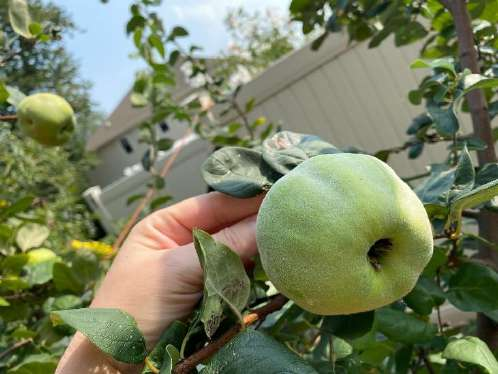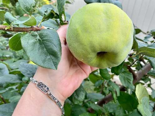 А вот и та самая айва, которая в этом году тоже удивила меня и размером своих плодов, и их количеством. Дело в том, что, как и несколько других деревьев, айва почти погибла после посадки в глинистую почву. И, как и у черешни, все ветки и главный ствол засохли, но осталась одна живая веточка, которая на следующий год дала много сильных побегов, и даже три плода, но они были мелкие и побитые жуками. А вот в этом году все оказалось грандиознее, и я не только приятно обрадована тем, что деревце и оклималось, и стало бурно развиваться, но и отблагодарена прекрасными множественными плодами за мою настойчивость и продолжение работы с Флорой по спасению айвы! Я терпеливо жду, когда окрас плодов сменится на желто-оранжевый, и тогда – налопаюсь сама, ну и с сестрой мужа поделюсь, ведь это ее любимые фрукты. И Белке оставлю.