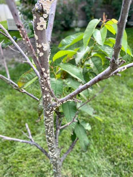 В этом году почти все деревья в нашем саду дали невероятные побеги. На фото в этом репортаже вы увидете, что все побеги росли строго вверх. Даже две яблони на шпалерах, натренированные расти горизонтально, дали много новых вертикальных веток. И в этом году максимальная длинна побегов (у деревьев) – около полутора метров!  Еще один ужасный фактор глинистой почвы это – плесень. Деревца покрывала зеленая мерзость, и плоды рождались скукоженные и сморщенные. Поэтому я несколько раз корректировала программу для Флоры, адресуя именно плесень. И вот в этом году я увидела заметные результаты – бляшки зеленого грибка почти совсем исчезли! Кора на яблонях – а они страдали от плесени больше всего – стала приятного коричневого цвета, и словно вощеная. Правда, появился новый неожиданный вредитель – белый пластиковый грибок, вы его увидите на фото. Но и с ним я разберусь.